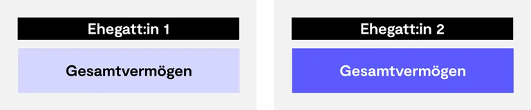 Bei der Gütertrennung lassen Anna und Jonas ihre Vermögen gänzlich getrennt, unabhängig davon, was vor oder während der Ehe erworben wurde. Man spricht hier vom Gesamtvermögen beider Parteien. Dieser Güterstand kann in bestimmten Fällen auch durch ein:e Richter:in angeordnet werden, zum Beispiel, wenn ein:e Ehegatt:in überschuldet ist.